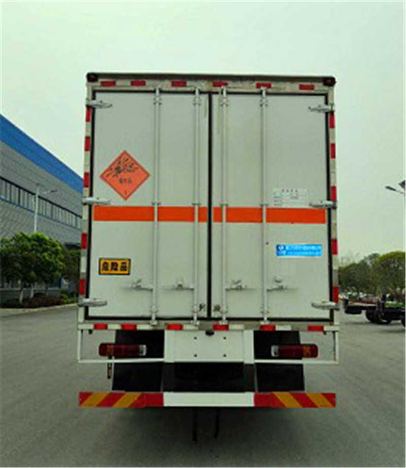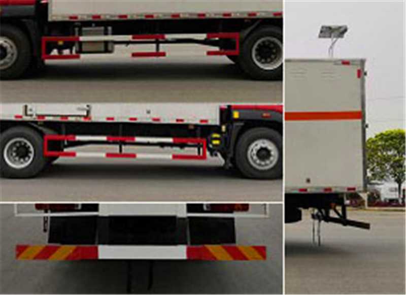 其它 | 該車適用于運輸危險品。危險貨物運輸車輛的類型為EX/III。廂體頂部封閉,不可開啟。選裝右側箱體不開門,選裝側門型式及位置.僅采用底盤子午線輪胎和帶ABS的底盤,該車前輪安裝盤式制動器,前置排氣管,裝配限速裝置,限速80km/h。安裝帶有衛星定位功能的行駛記錄儀。安全裝置為導靜電帶,用于防止靜電。整車長度/軸距/后懸對應關系為(mm):8900/5250/2360,8900/4800/2810,8500/4500/2710,8500/4800/2410。該車主要用于運輸獨立容器包裝的介質:黑火藥,壓縮黑火藥,電引爆雷管,爆破炸藥,硝胺炸藥。運輸介質類項號:1.1D,1.1D,1.1B,1.1D,1.1D。側防護和后防護裝置材料材質為Q235A碳鋼,側防護與箱體底部焊接連接,后防護裝置與車架采用焊接連接。后防護截面尺寸(mm):120×50,離地高度為500mm,發動機WP4.6NQ220E61對應的油耗值(L/100km)為:25.89。ABS型號為CM4XL-4S/4M,生產廠家為廣州瑞立科密汽車電子股份有限公司。 | ||